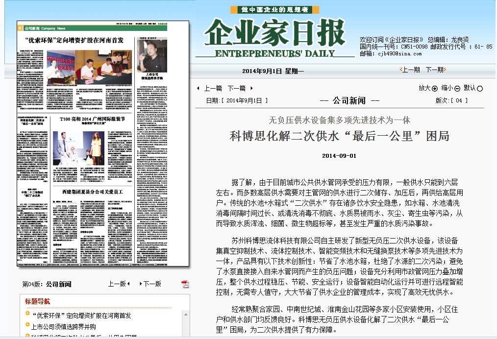 喜訊,2014年9月1日《企業(yè)家日報》第4版報道了我公司無(wú)負壓供水設備的相關(guān)情況,以下為報道的具體內容: